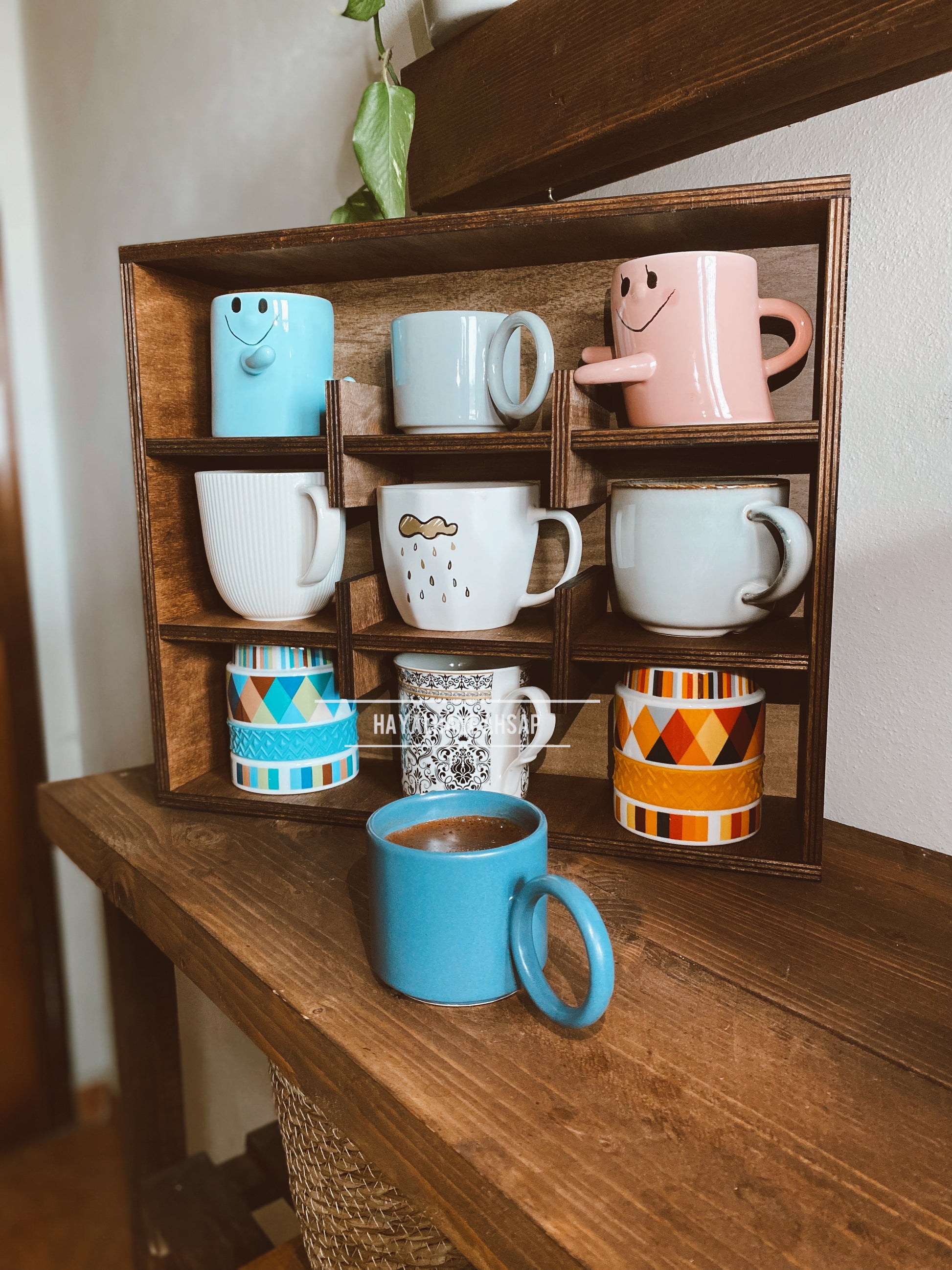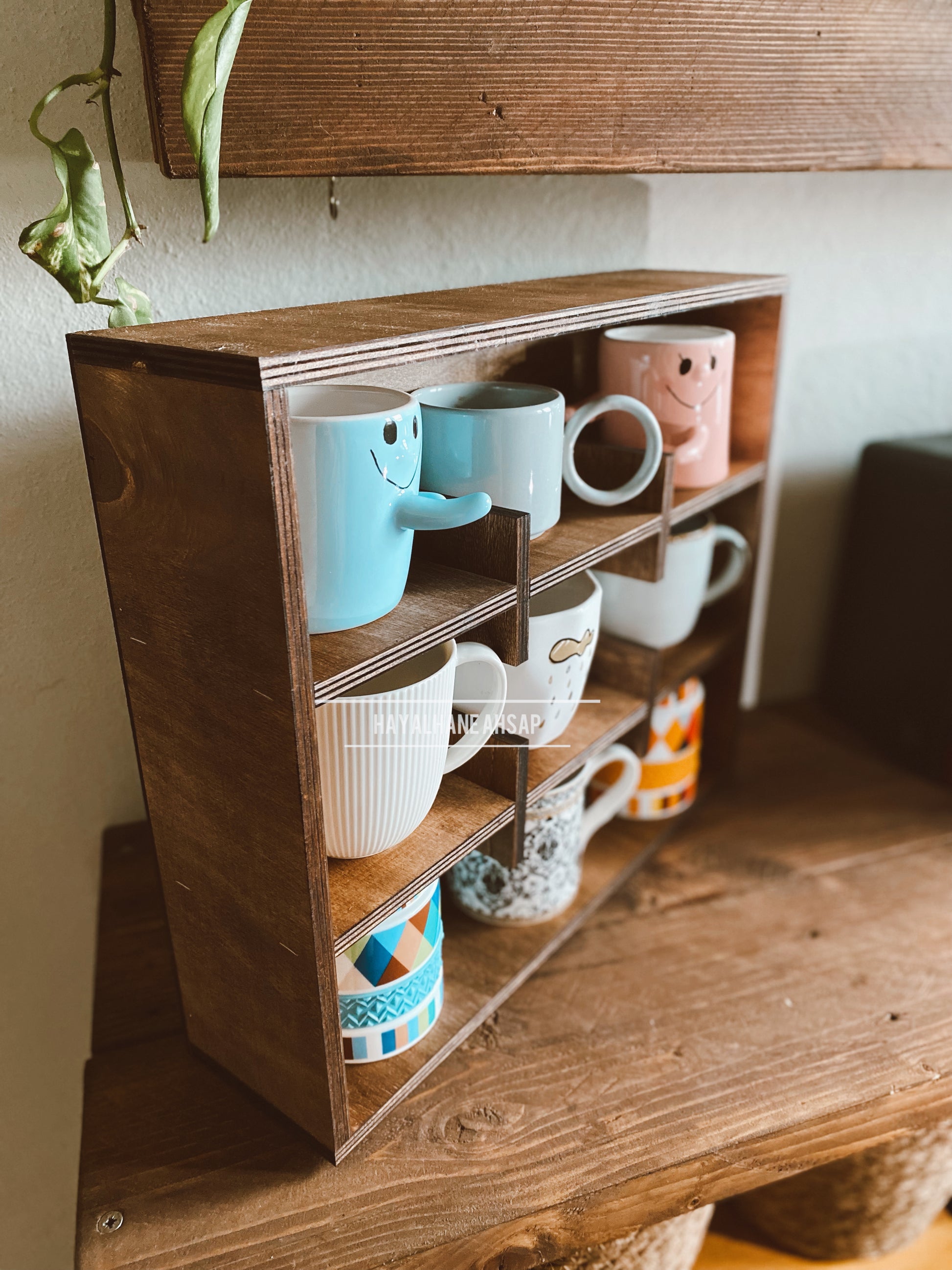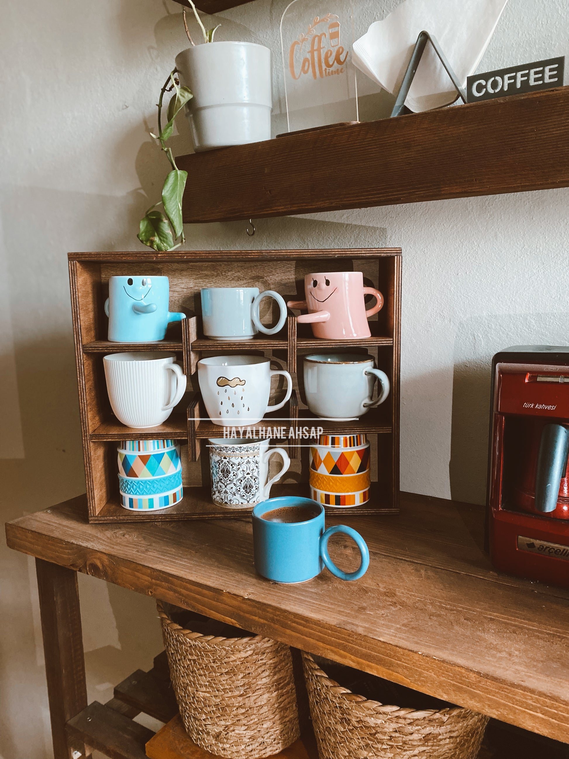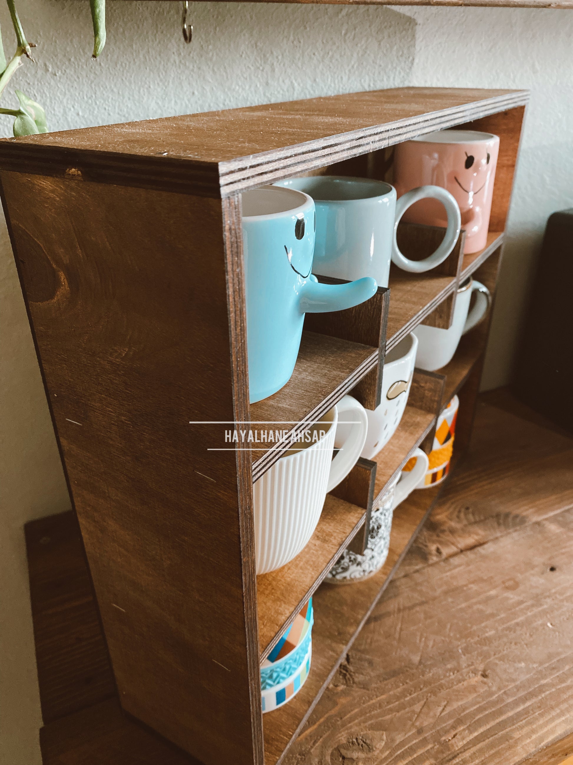 Ahşap Kupa Rafı/ Özgün tasarımlı bu raf ile en sevdiğiniz kupa, obje ve fincanlarınızı sergileyebilirsiniz. Dilediğiniz alanda kullanabileceğiniz ürünün ceviz renk tonu ürünlerimiz arasında bulunuyor.