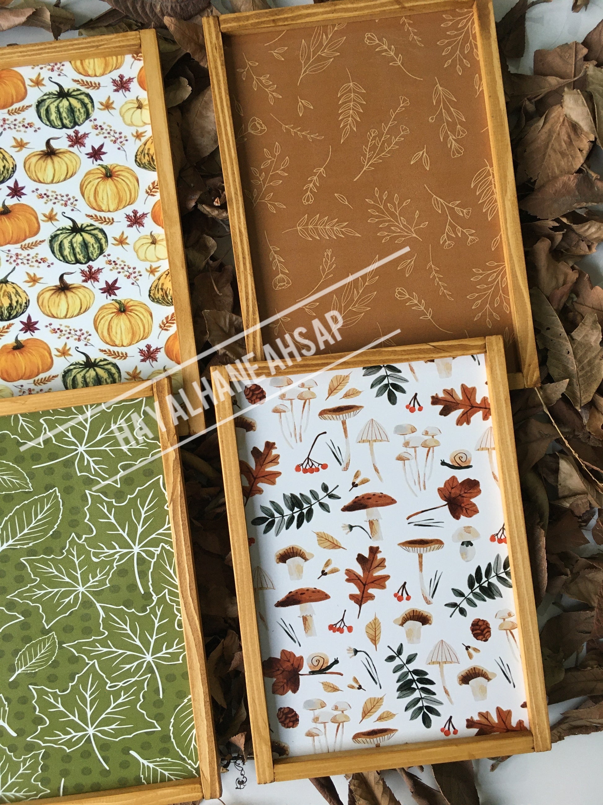 Sonbahar renklerini ve ruhunu yansıtan tablolar masif ahşap çerçevelidir.