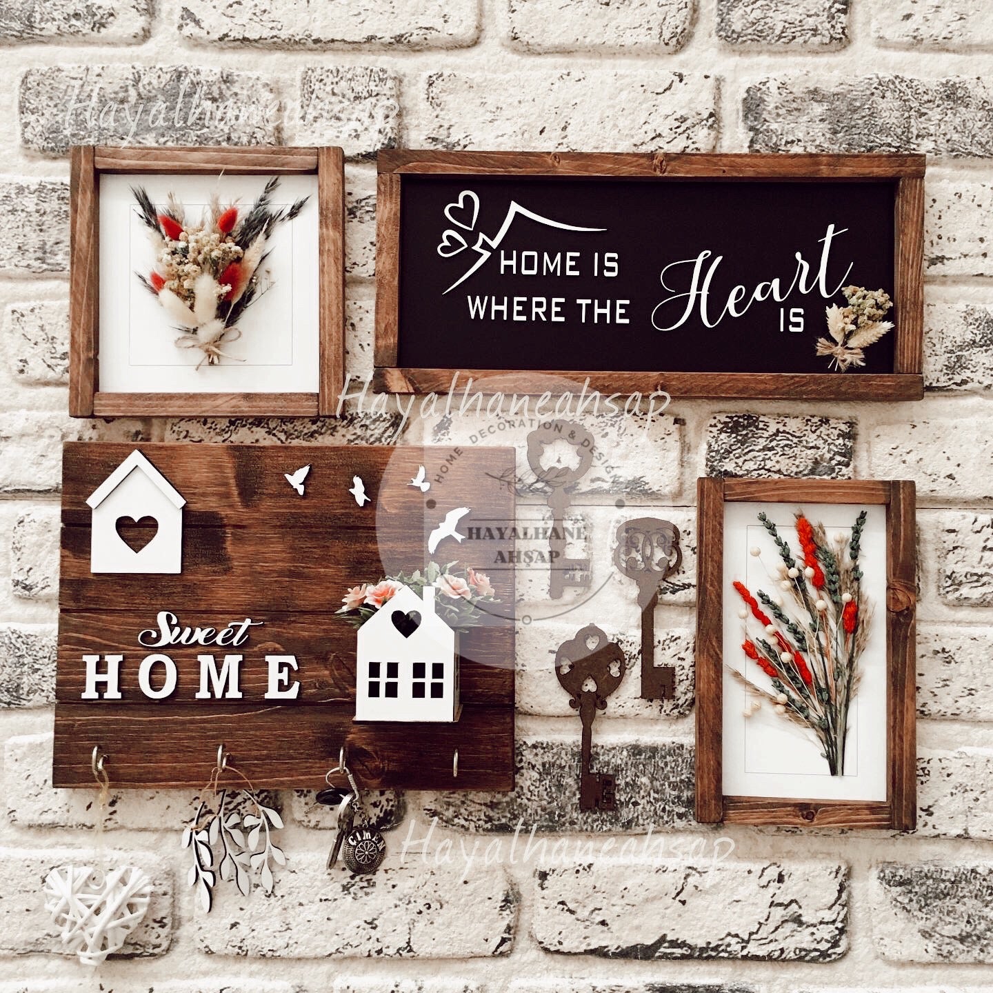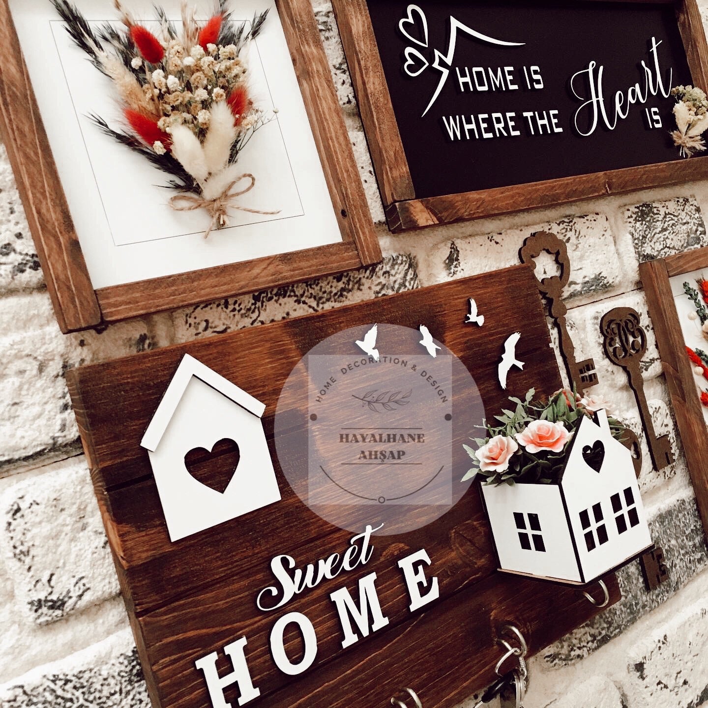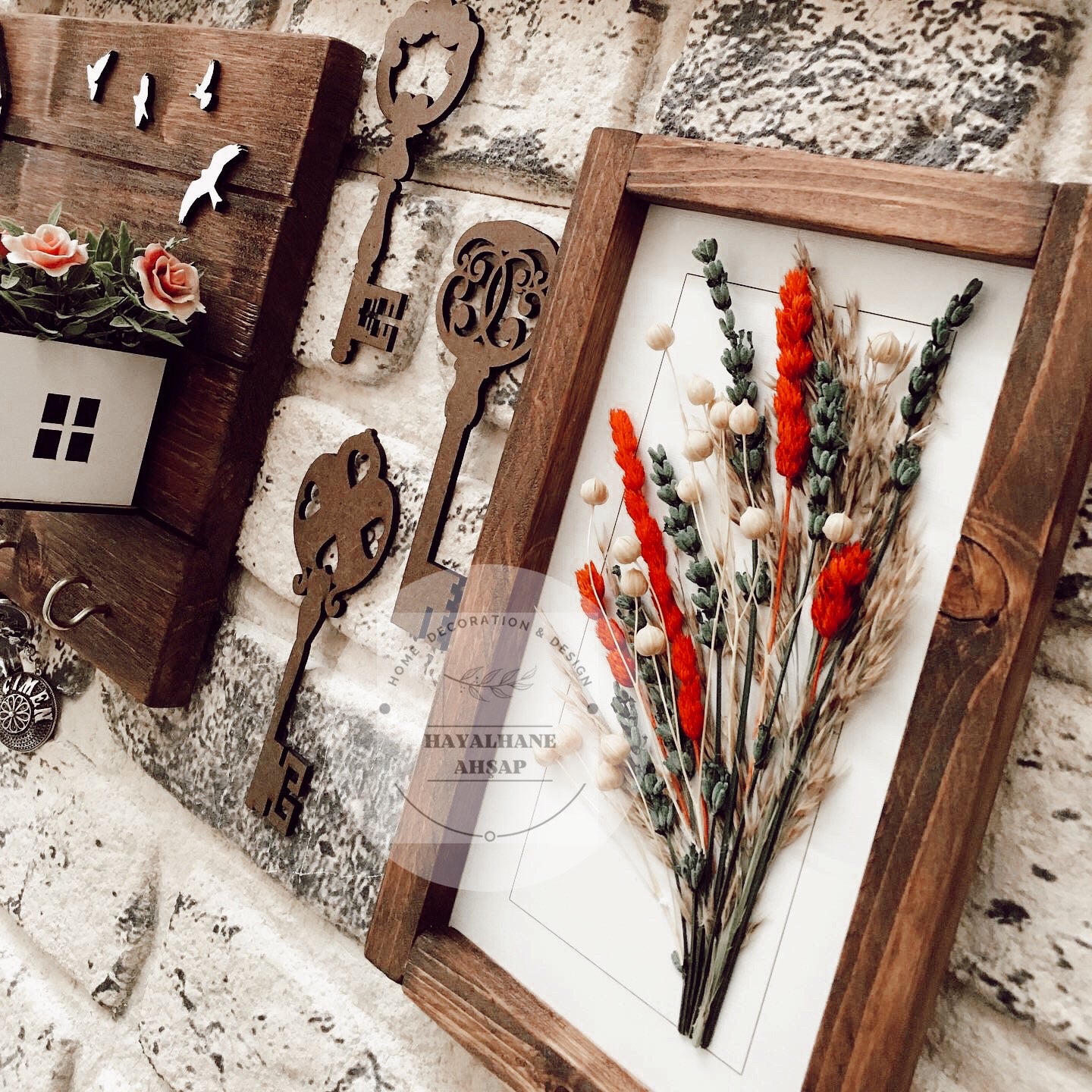 Masif ağaç çerçeveli ürünler içeriğinde lazer kesim kabartmalı ahşap yazılı tablo ve kuru çiçek buketi vardır. (Stok durumuna göre çiçek farklılık gösterebilir) Masif ağaç anahtarlık 25*35 cm ölçülerindedir.