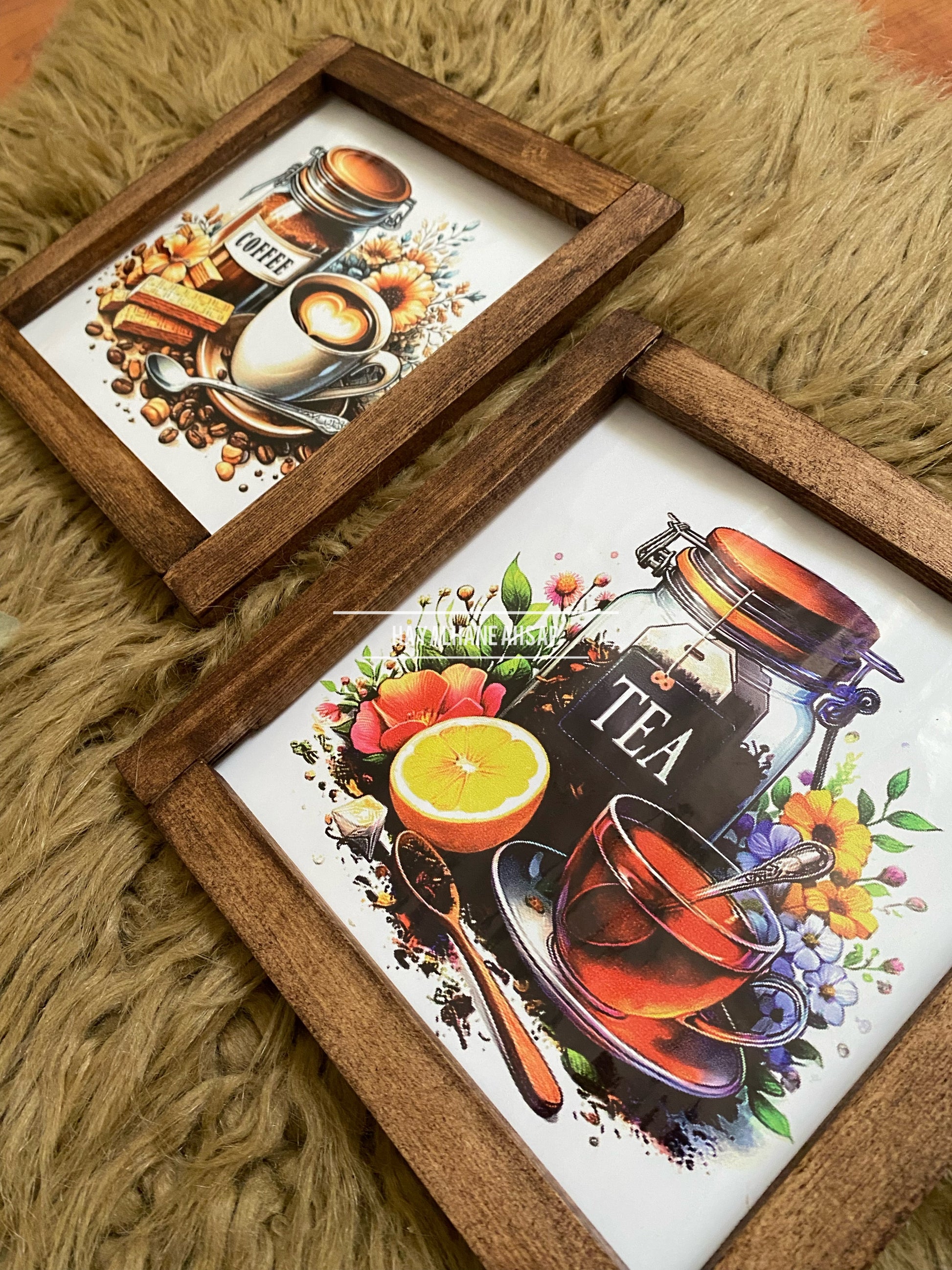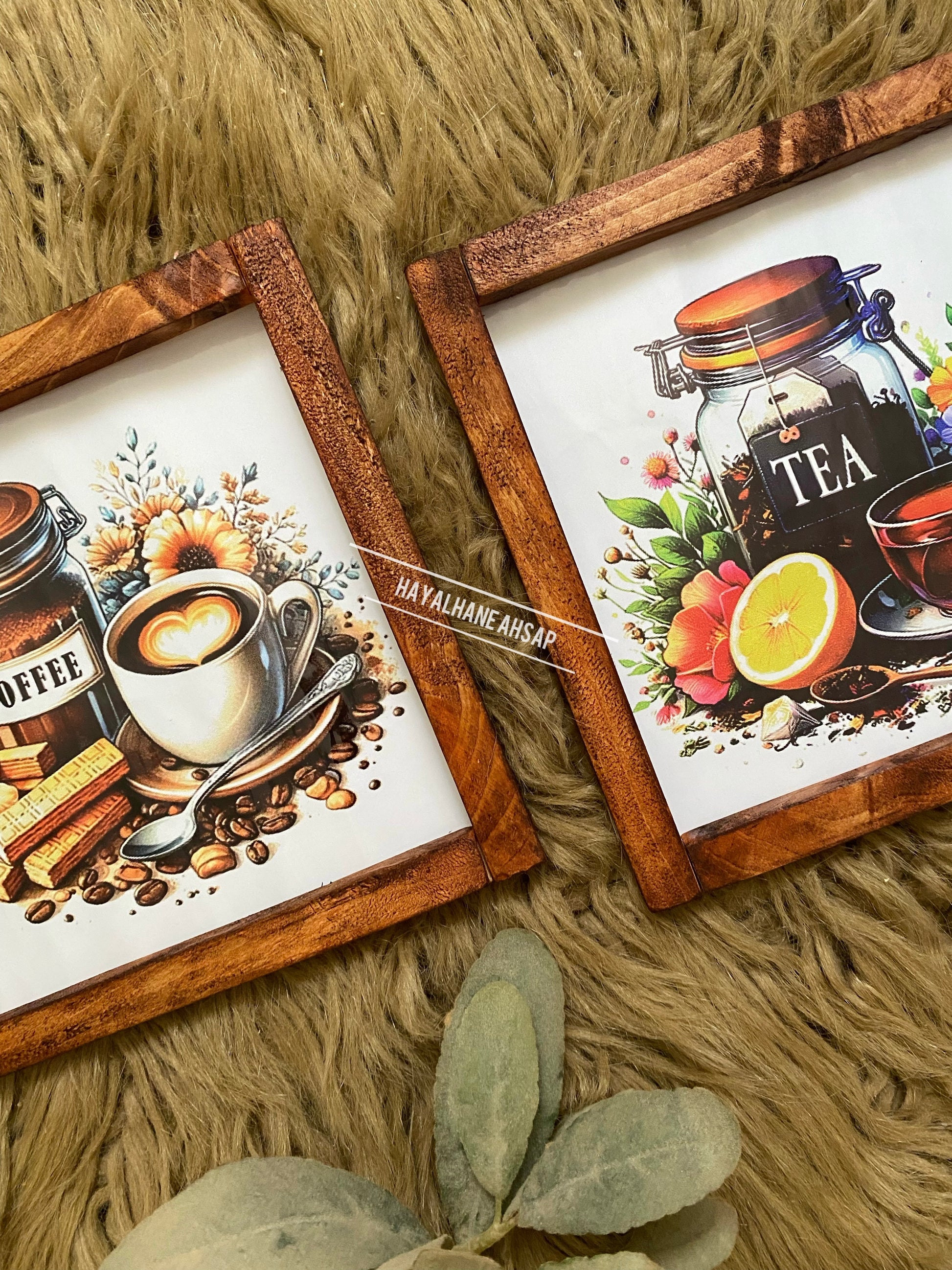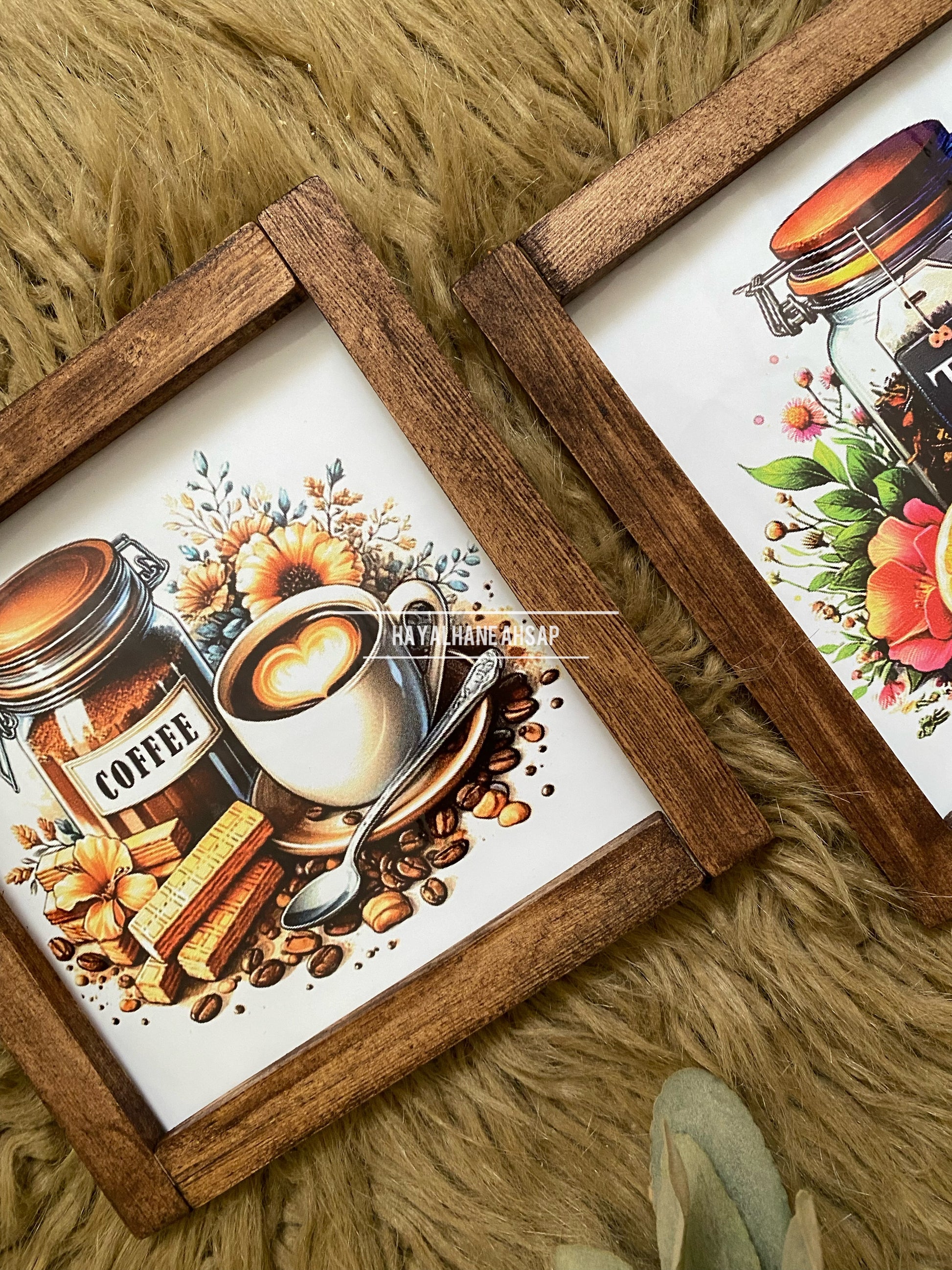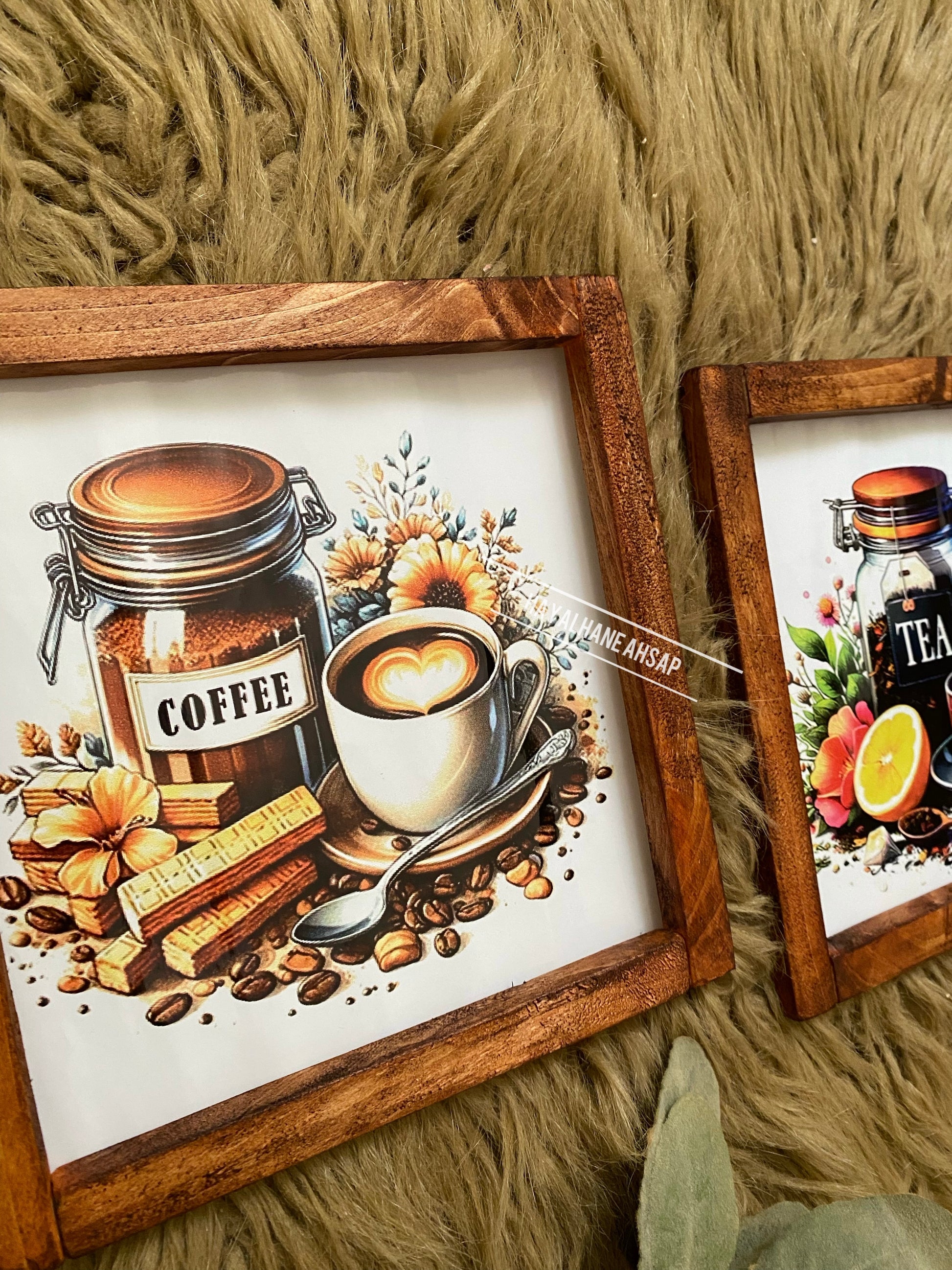 Ürünler masif ağaç çerçevelidir. İç kısımları ahşap üzerine parlak poster baskılıdır. Ürün 20*20 cm ölçülerindedir. Arkasında askı aparatı mevcuttur. Bantlı kullanmak isterseniz bize iletebilirsiniz.