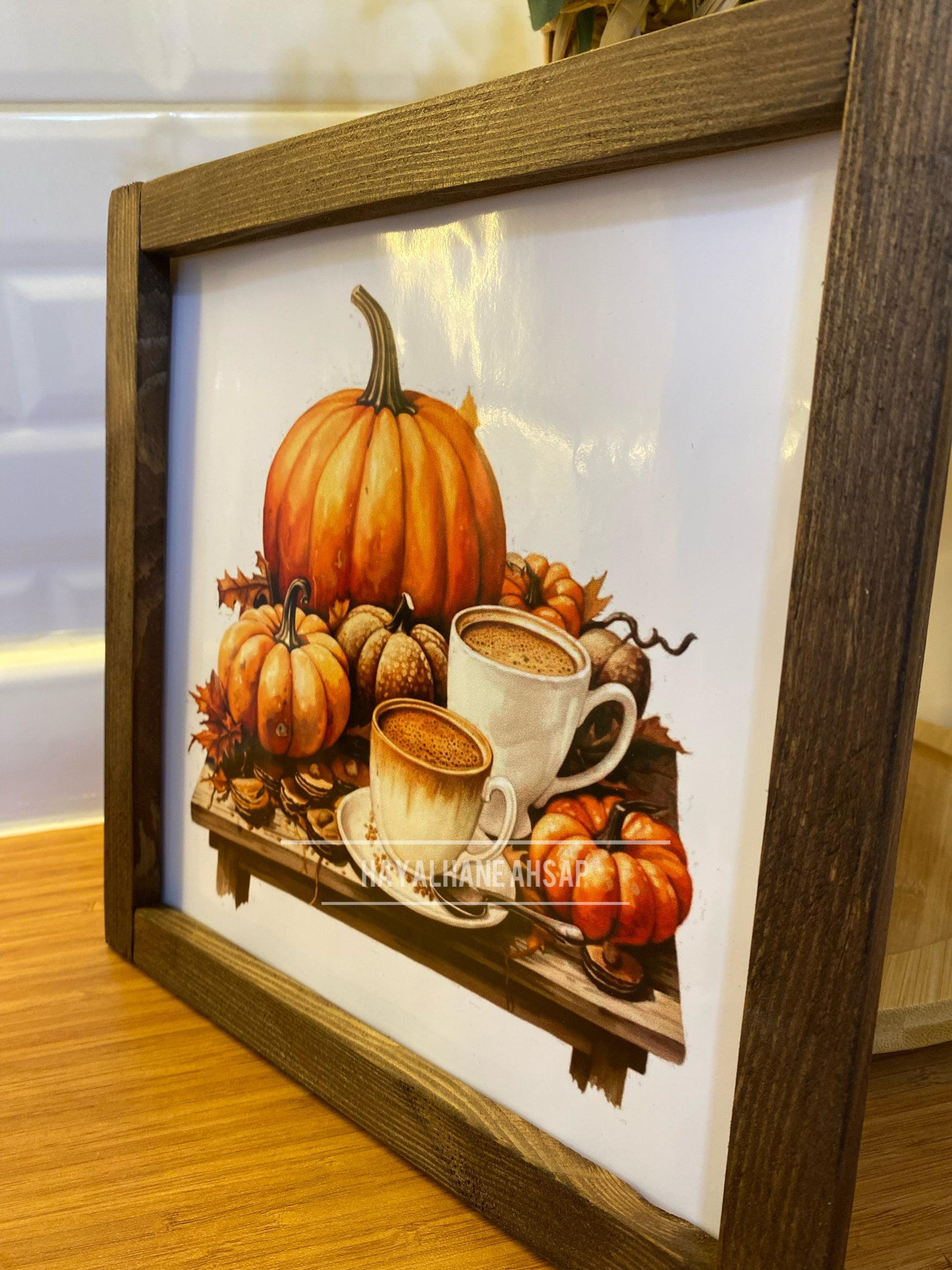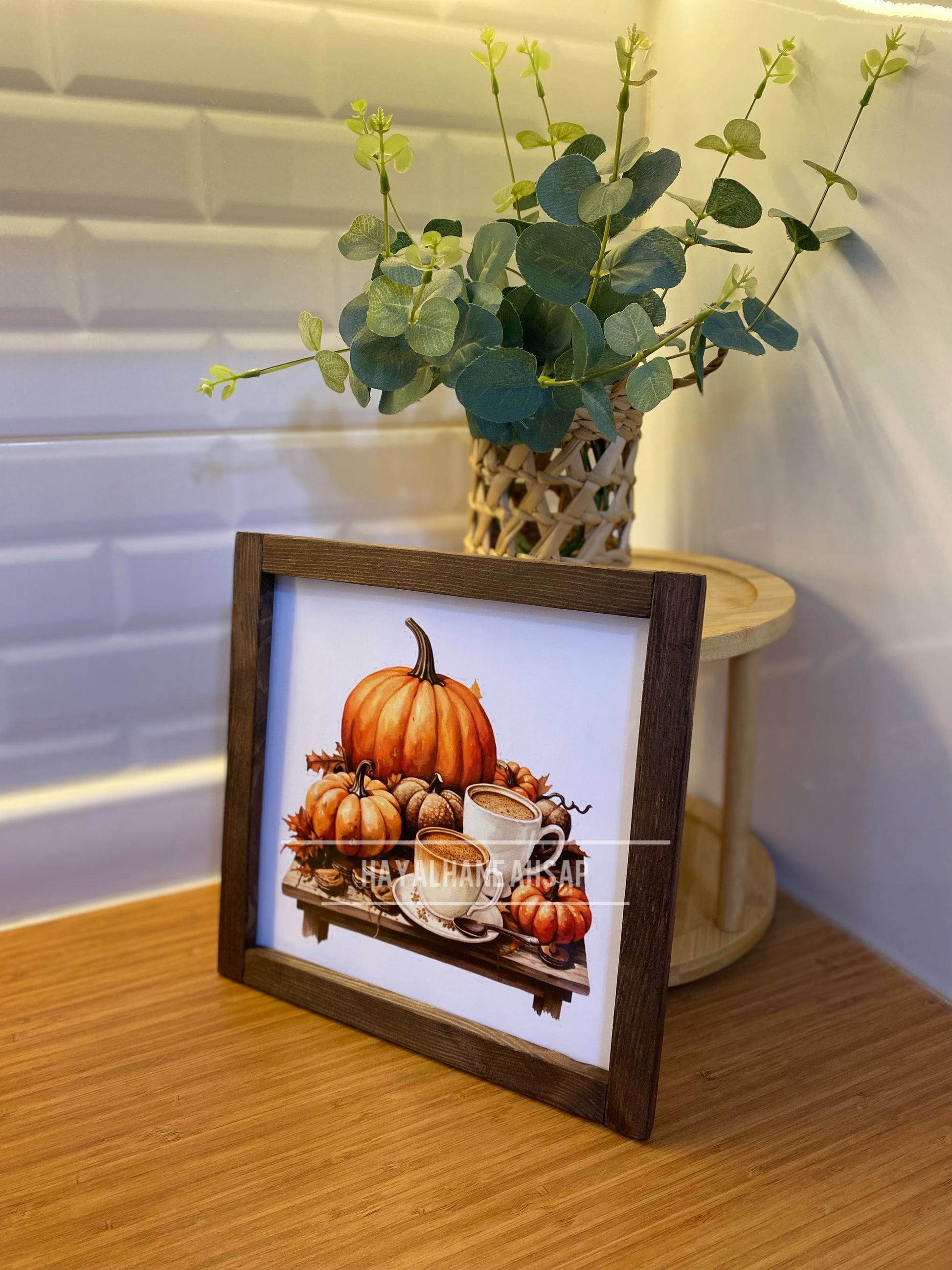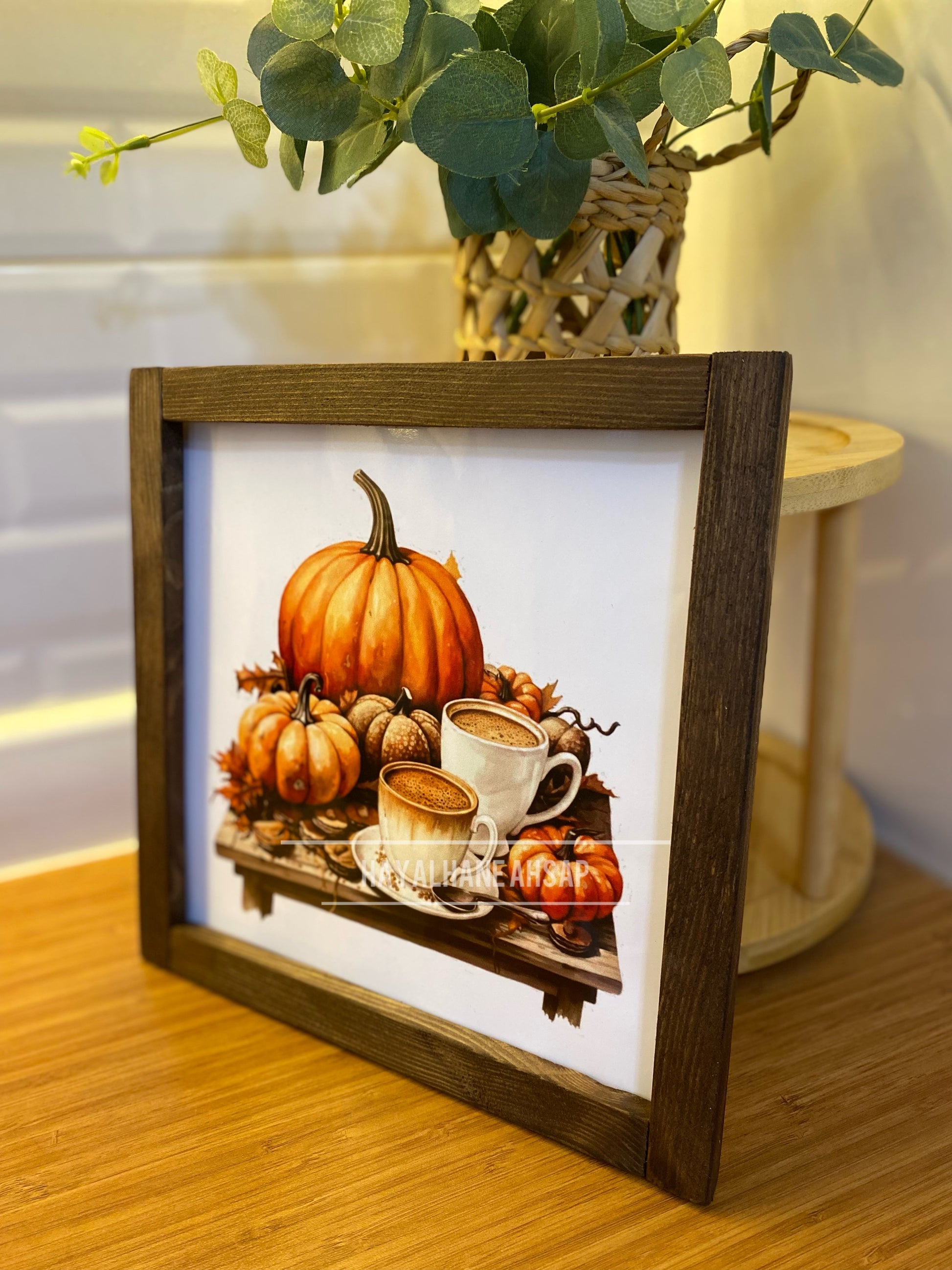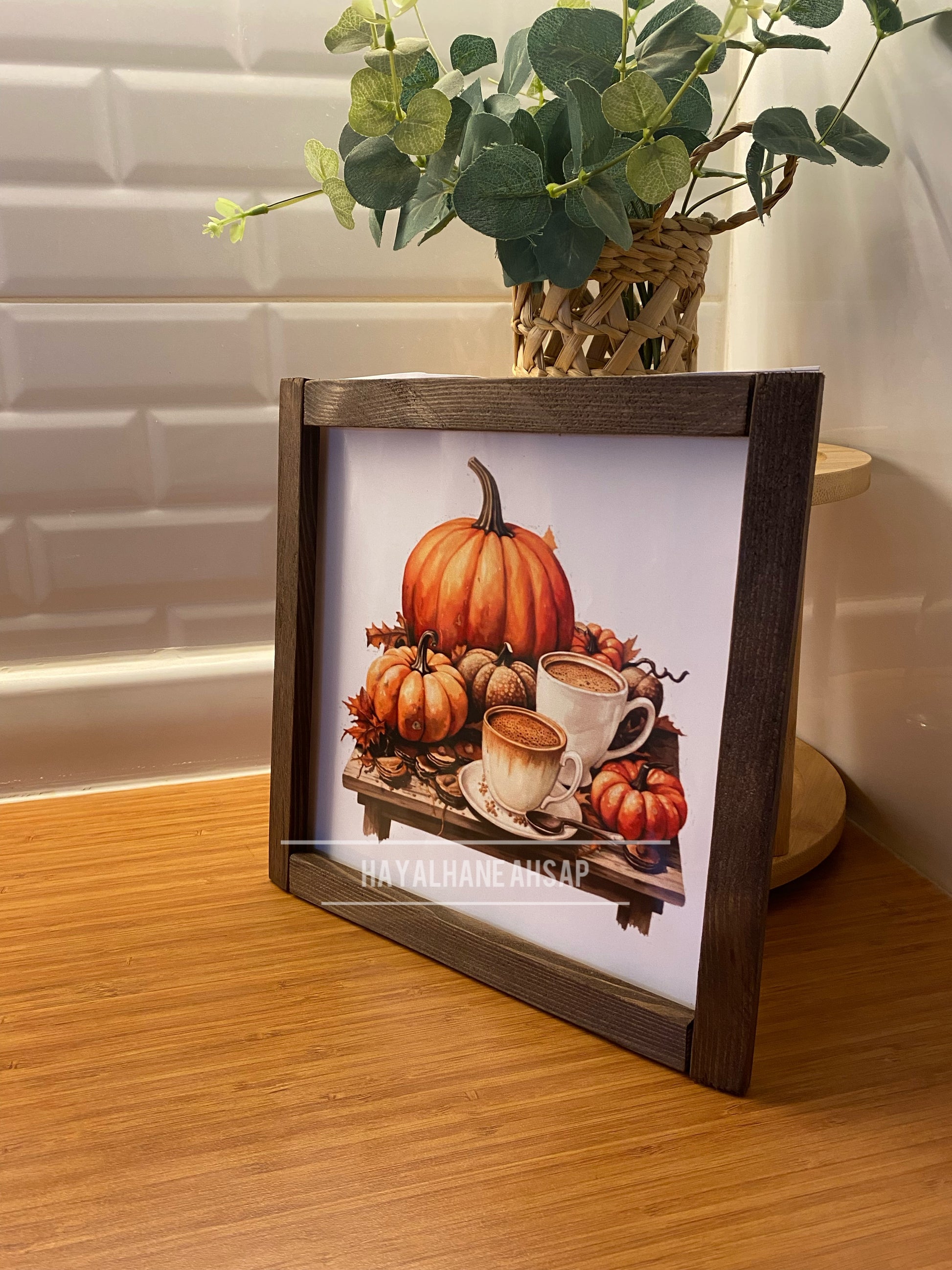 🍁 Sonbahar Sıcaklığı: El Yapımı Ahşap Çerçeveli Kabak ve Kahve Tablosu ☕