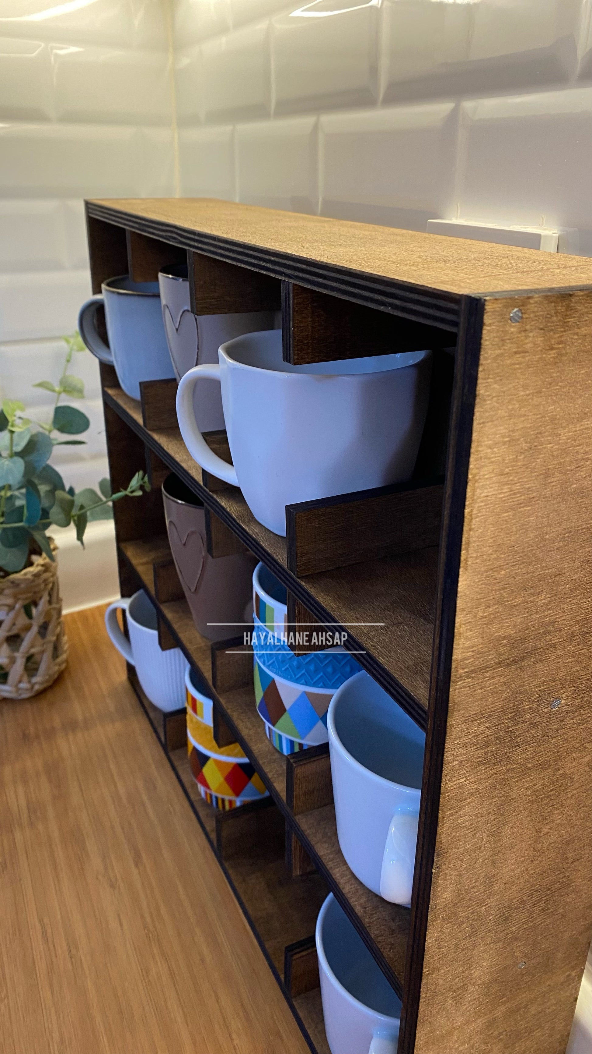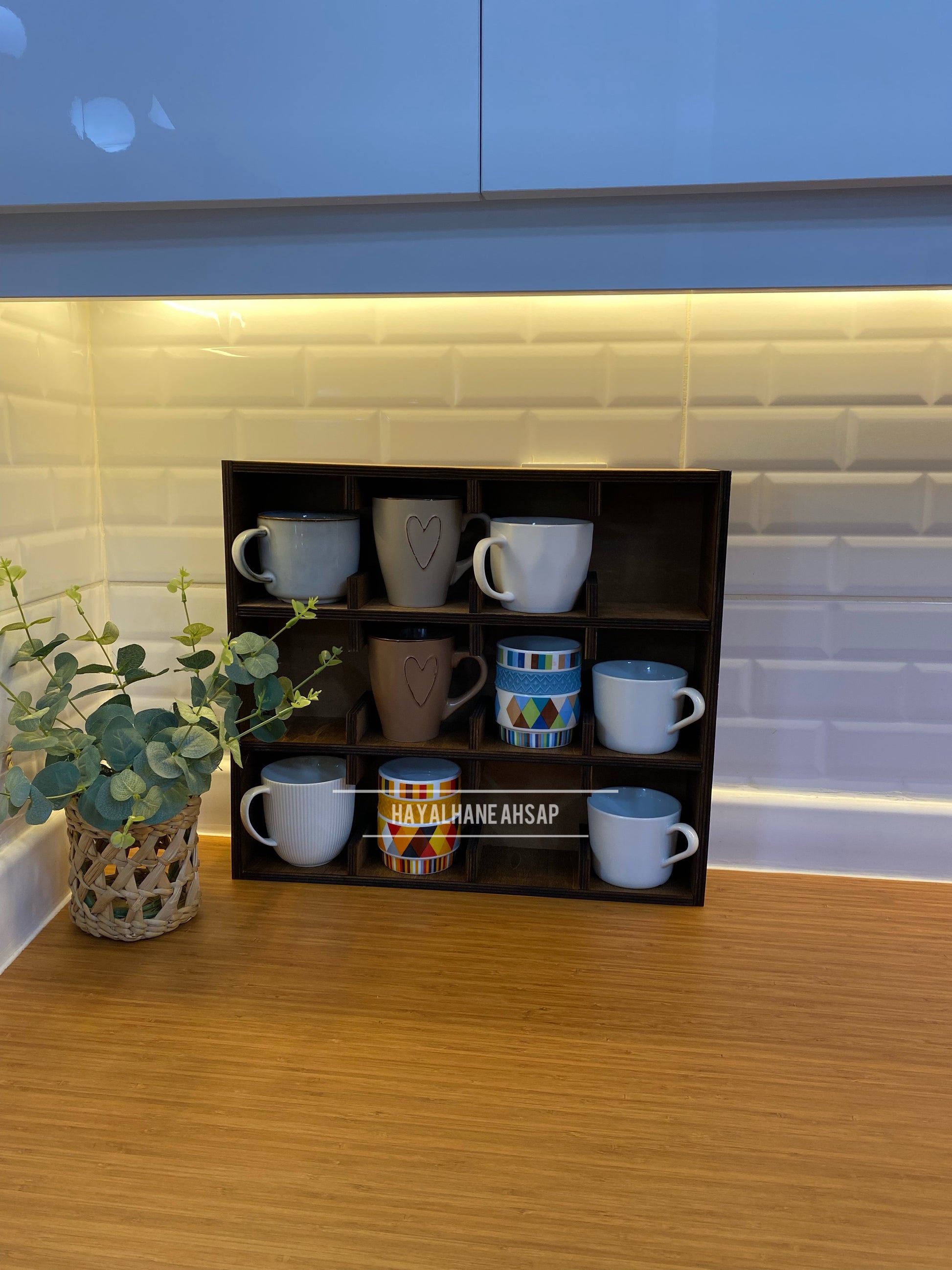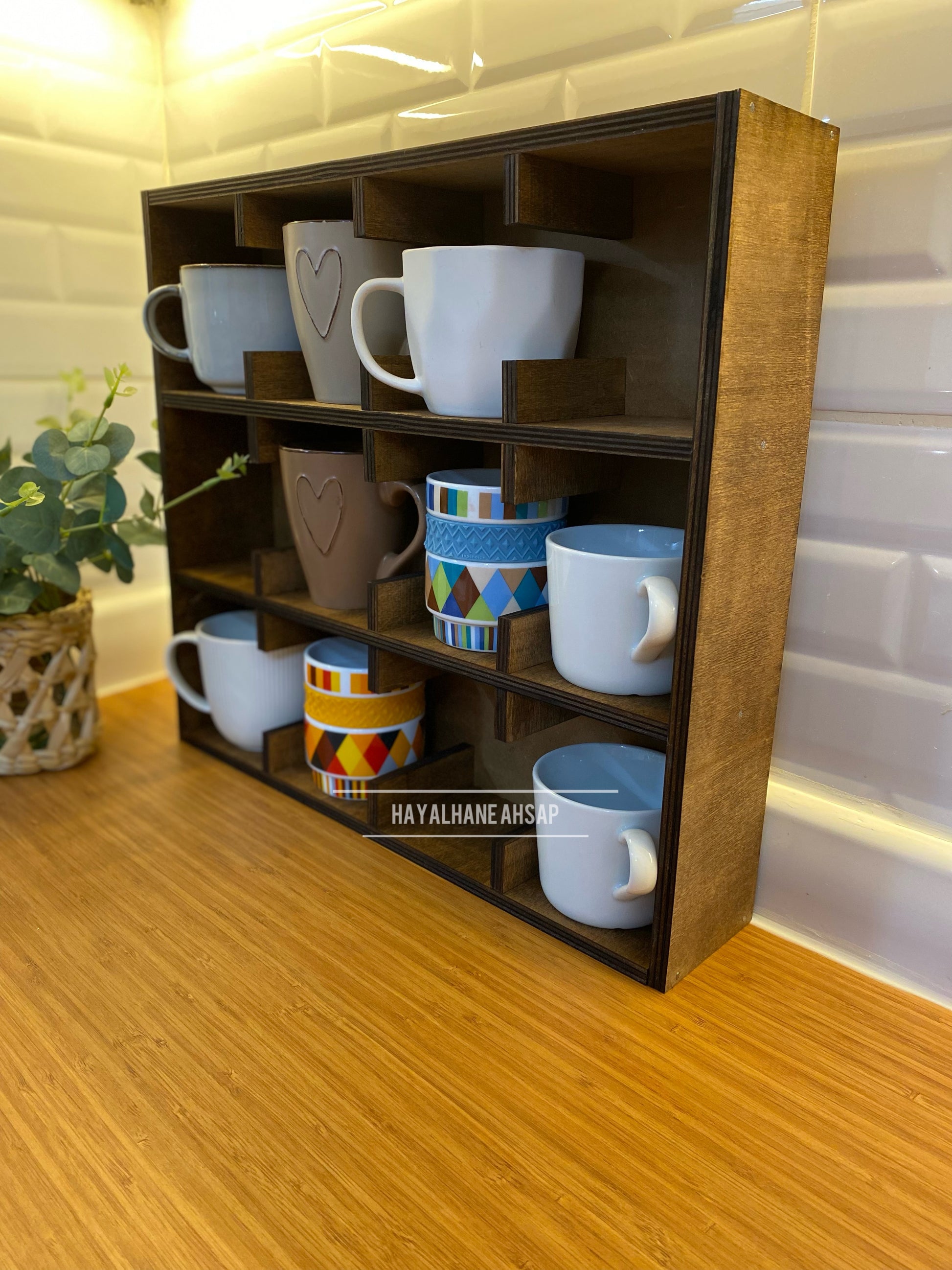 - Modern tasarımıyla mutfak dekorasyonunuza şıklık katan 12 bölmeli ahşap kupa bardak rafı.; 45*40*8 cm ölçülerindedir.; Raf bölmeleri 10x12x8 cm ölçülerindedir.