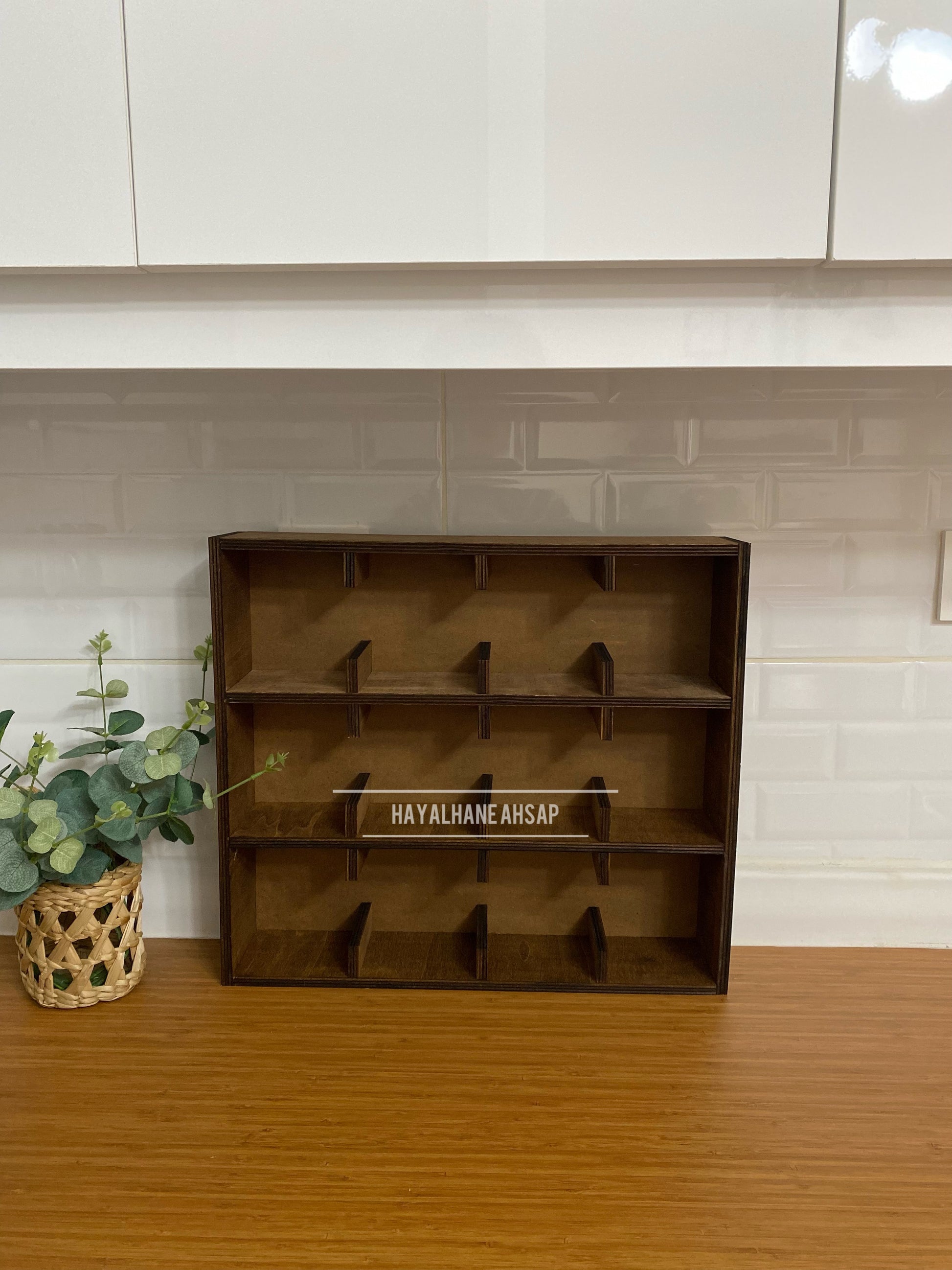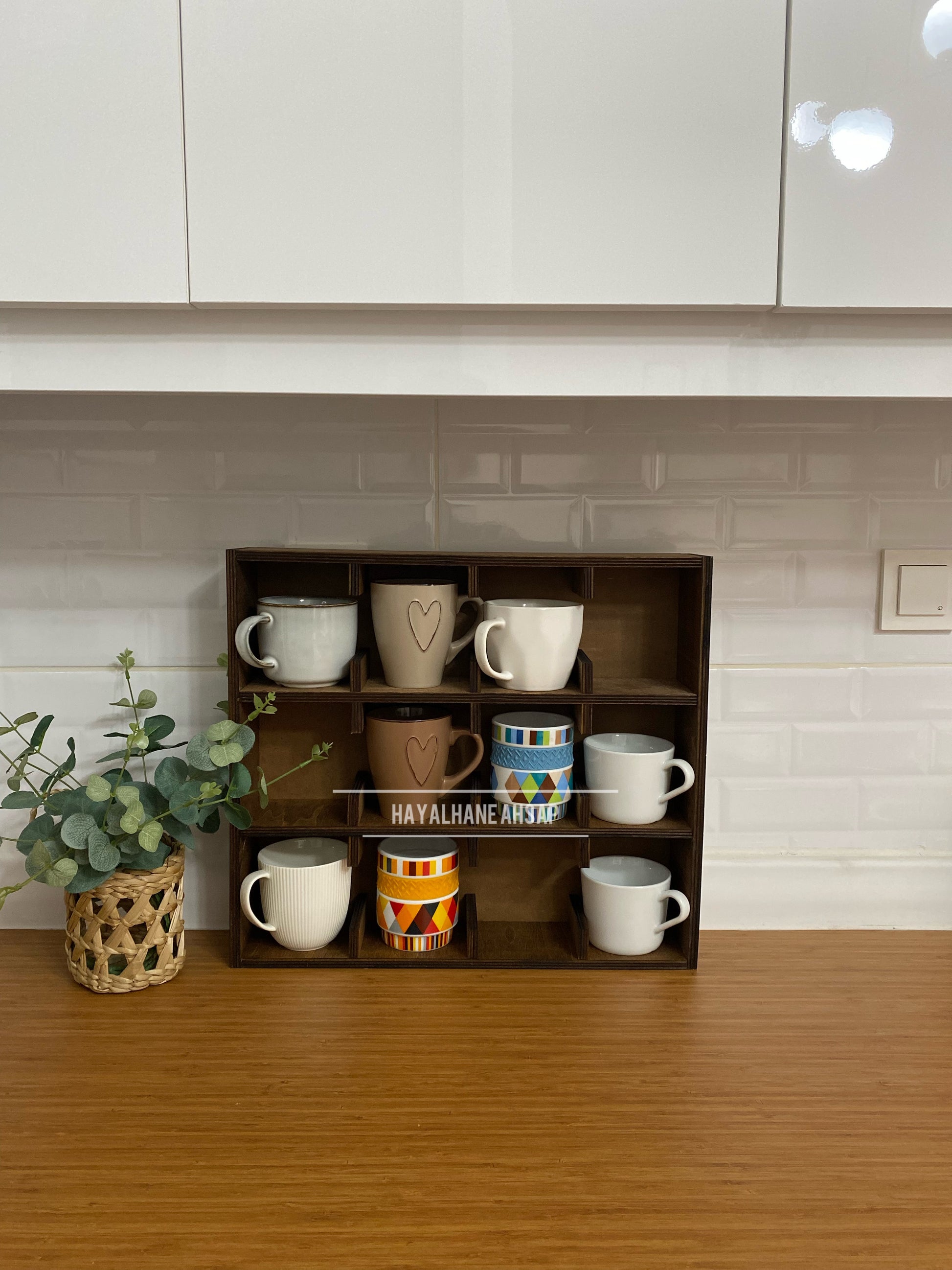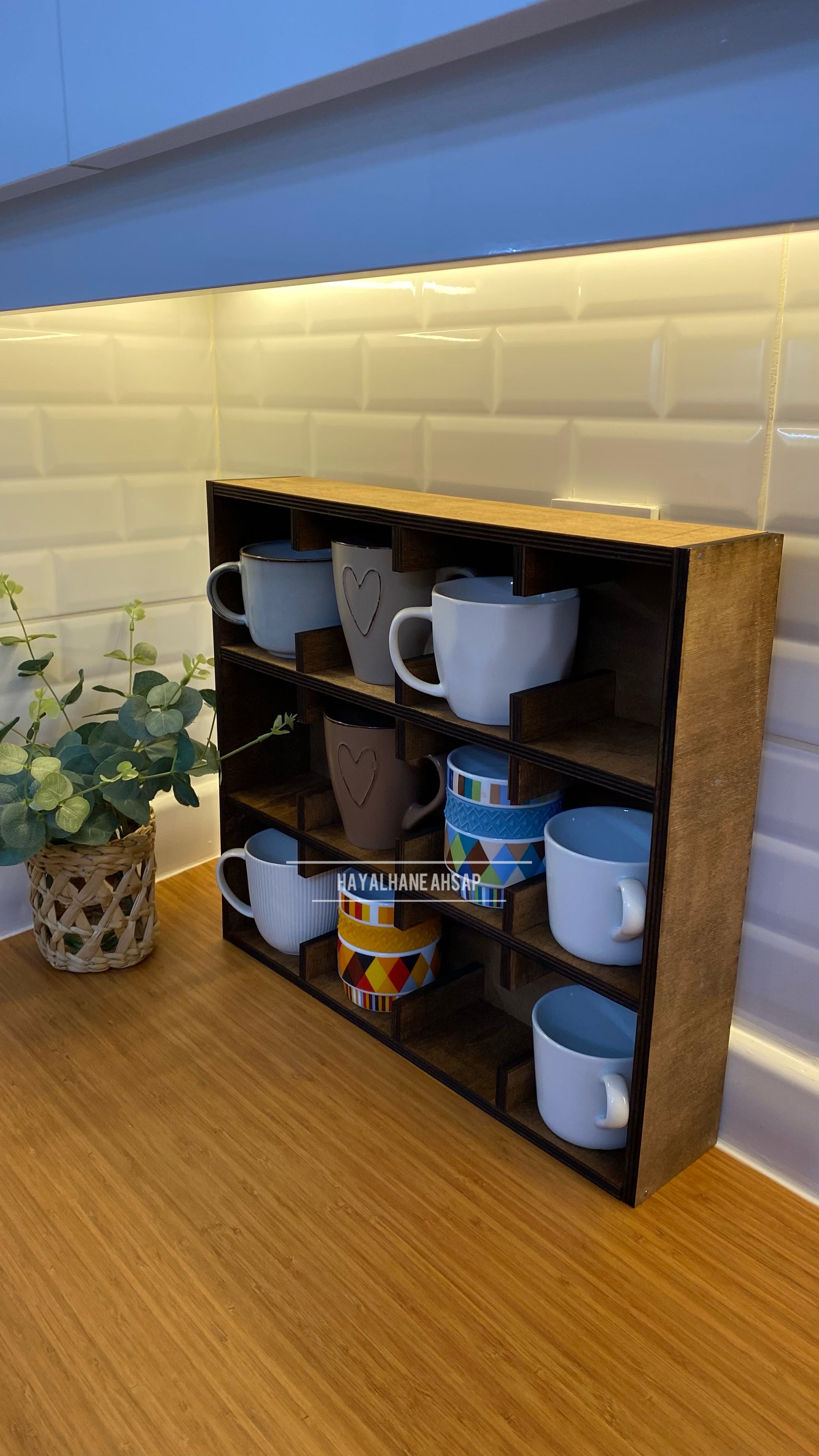 - Modern tasarımıyla mutfak dekorasyonunuza şıklık katan 12 bölmeli ahşap kupa bardak rafı.; 45*40*8 cm ölçülerindedir.; Raf bölmeleri 10x12x8 cm ölçülerindedir.