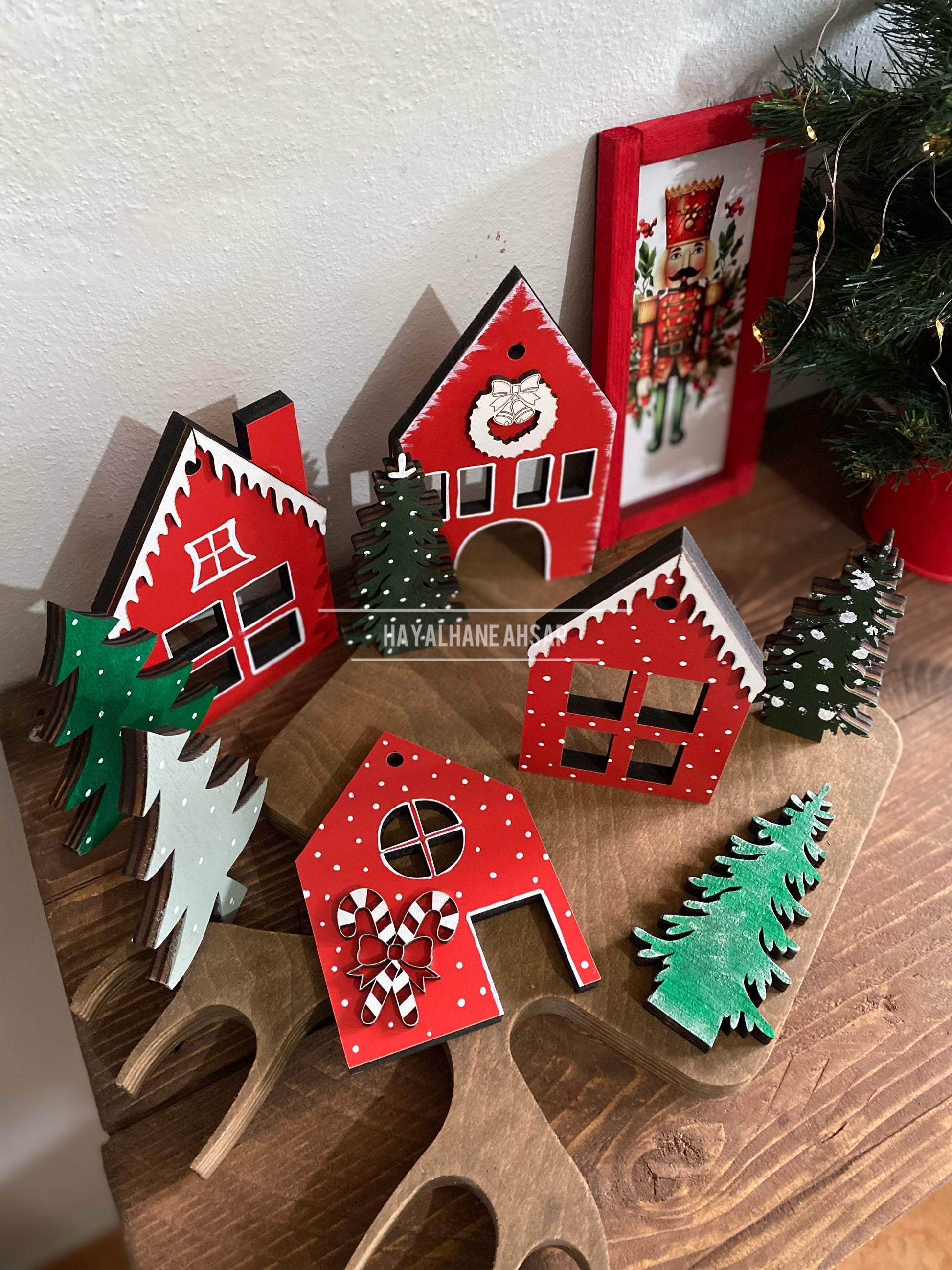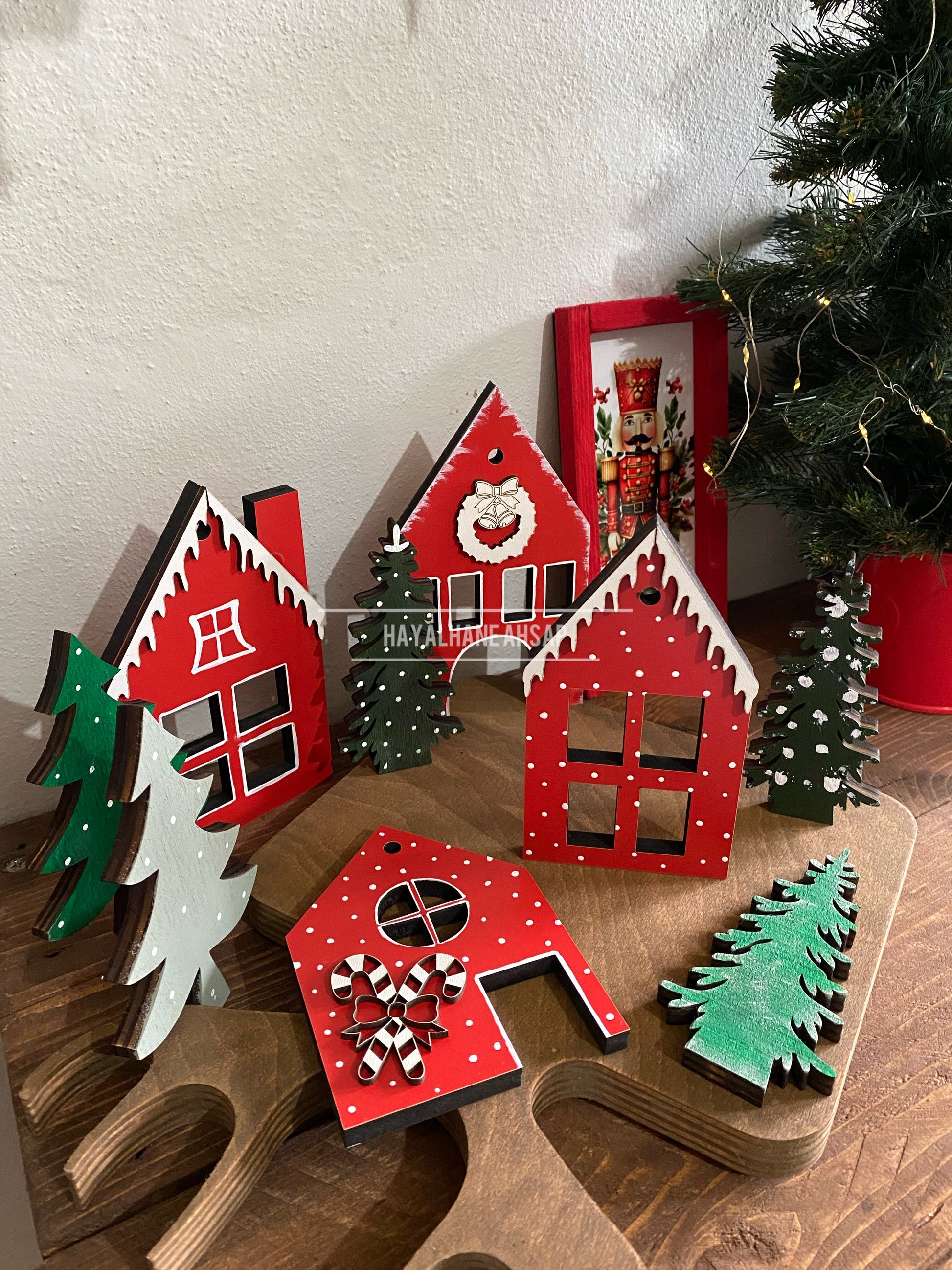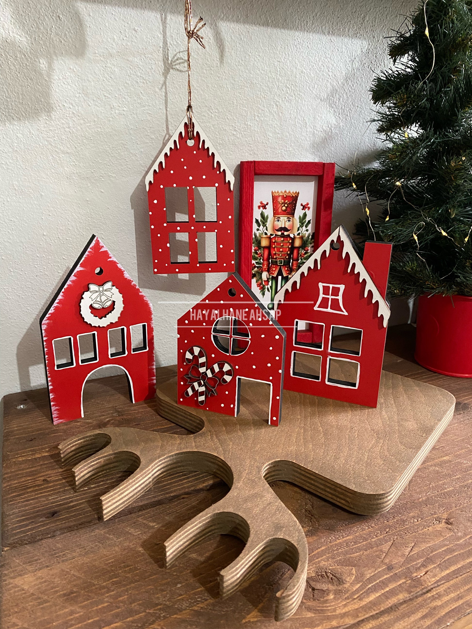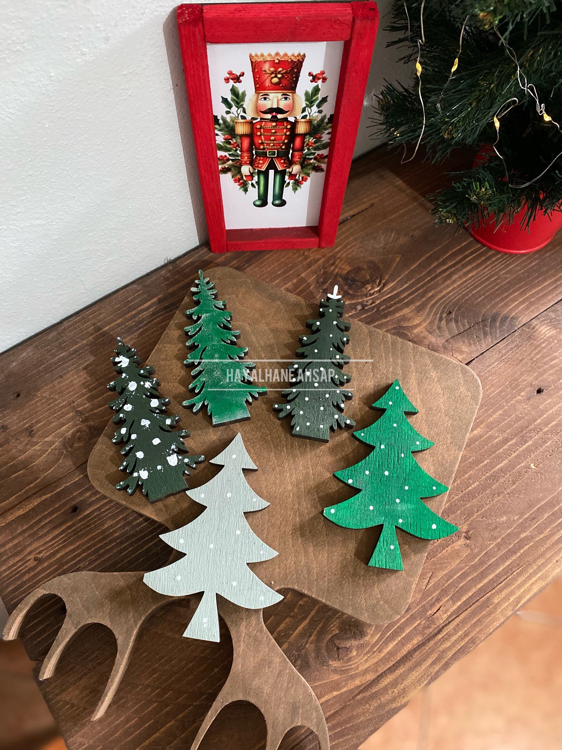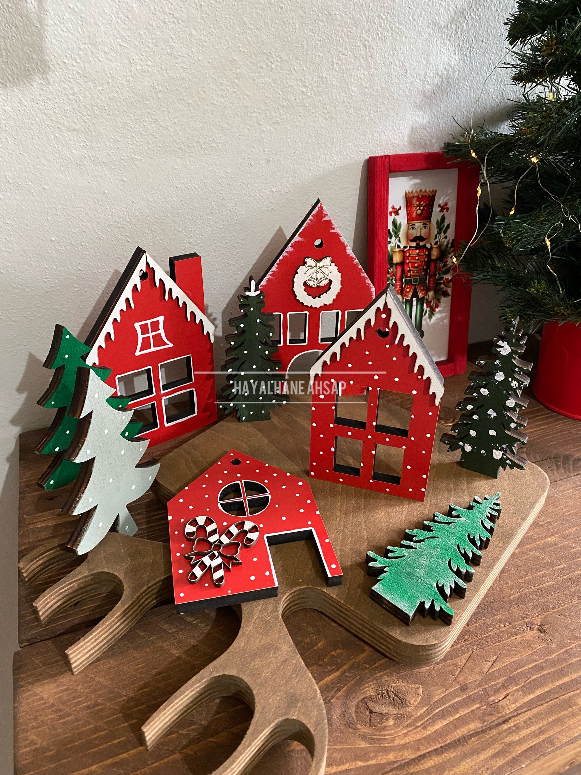 Yeni yıl ruhuyla el boyaması olarak hazırlanmış ahşap set.